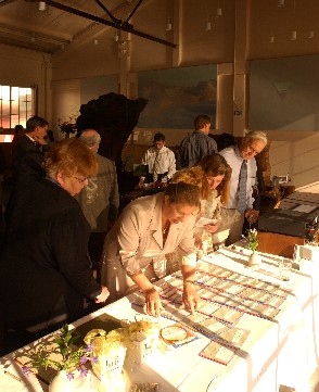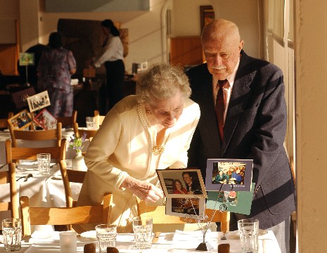 Our witnesses, Marie and Greg; Sharon, Rosanne, Linda, and Hans check in; LaNelle and Verl view the table photos